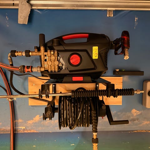 Ava høytrykkspyler i frittstående modell med hjul og integrert slangetrommel. Enheten har høytrykksslange som kan rulles opp på trommelen, pistolhåndtak med slange, samt flere dyser og tilbehør som oppbevares på toppen av maskinen. Fargekombinasjon svart og rød da det var en Bilpleiekongen-edition. Egnet for rengjøring av uteområder, kjøretøy og andre overflater som tåler høytrykksspyling.