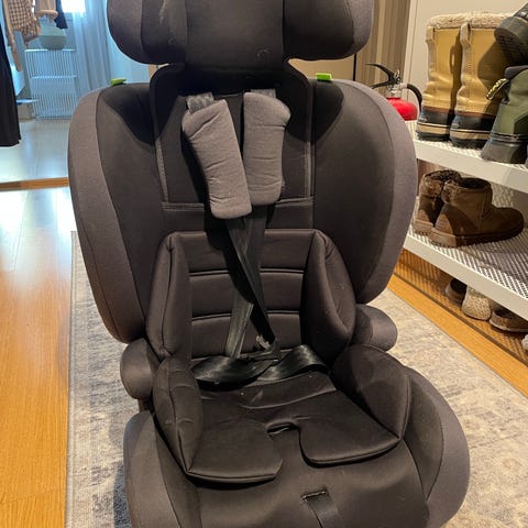 Bakovervendt, festes med belte. Følger med innoegsputer som kan brukes etter størrelsen på barnet. Pent brukt til ett barn i bil nr.2.