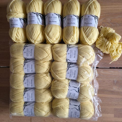 Gjestal Soft Kitten garn i børstet alpakka-blend. Garnet består av 50 % alpakka og 50 % akryl. Nøstene veier 50 g hver. Fargekode 322 (parti 1428), gul nyanse. Har 12 + rest ca 1.5 nøste