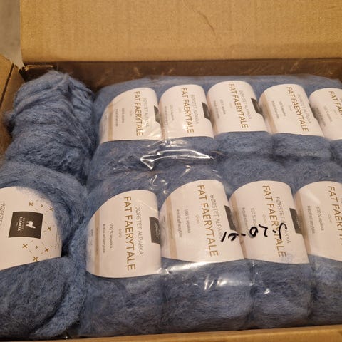 Hobbii Denim Breeze garn i blå farge. En pakke med 20 nøster som til sammen veier 1000 g. Uåpnet.