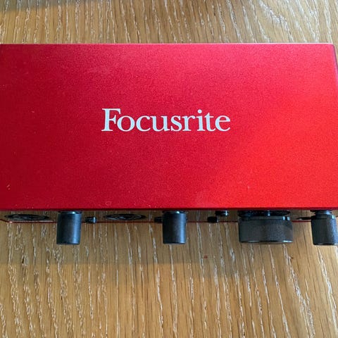 Pent brukt Focusrite Scarlett med dekkplasten fortsatt på både i front og bak.