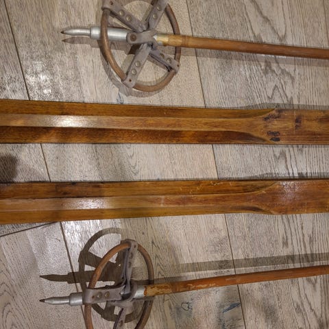 Dekorative ski og staver med fin patina og med bindinger