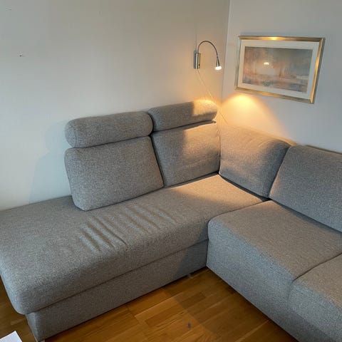 Sofaen fungerer som den skal. Den har vanlig slitasje, men ingen store skader.Trekket på putene er litt falmet noen steder.
