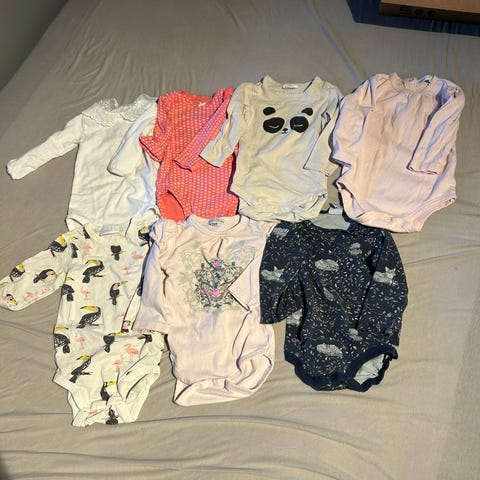 Bodypakke i str 68 til jente fra ulike merker. Alle er pent brukt, men kan ha noen flekker som ikke går bort i vask. Ellers hele og fine.
