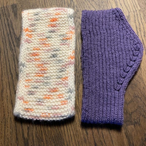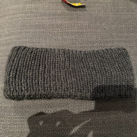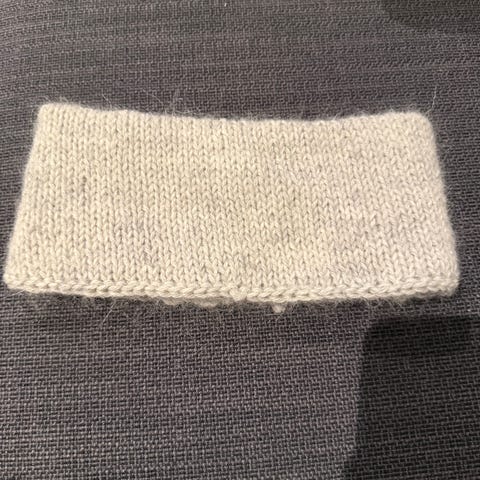Pannebånd strikket i merinoull og tynn silk mohair, omkrets: 48cm