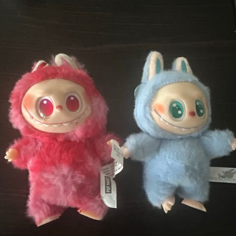Disse er 2 labubuer en er lilla og den ante er rød/rosa jeg håper noen vil ha dem, 1 labubu koster 200 de er pent brukt