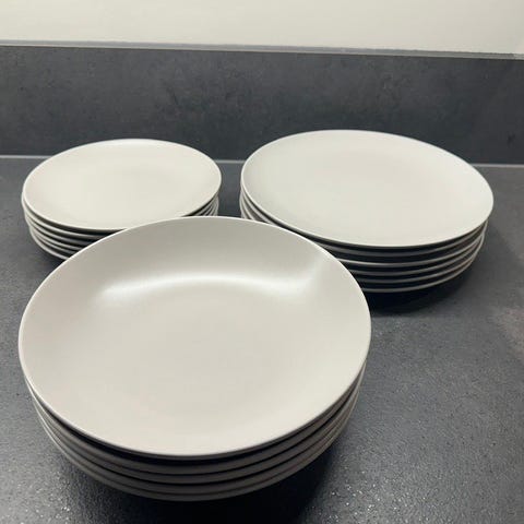 Värdera IKEA servisesett i hvit farge. 18 deler. Består av middags-, frokost- og dype tallerkener. Nøytral, rektangulær/avrundet form som passer til daglig bruk på kjøkken eller spisestue. Vært i daglig bruk, men ingen synlige merker eller mangler. Nypris 999,-