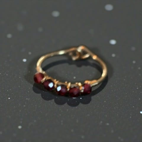 Denne elegante ringen i 14 karat gull er delikat, men likevel slående, og har tre rubiner satt i et sjarmerende klyngedesign. De rike røde steinene står i vakker kontrast til den varme gullringen, og skaper et smykke som er både minimalistisk og iøynefallende.