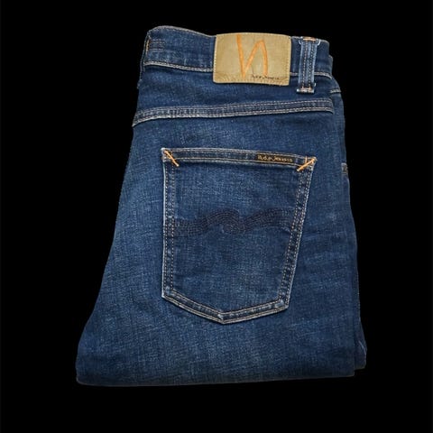 Nudie Jeans jeans i blå denim . Tror Buksa er damemodell fordi den er ganske stram nederst/skinny. livvidde W27 og benlengde L34,