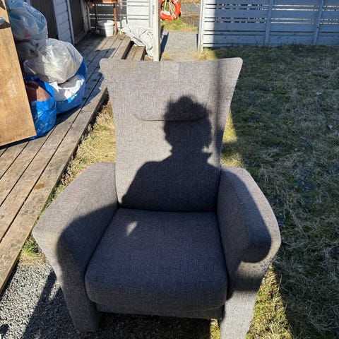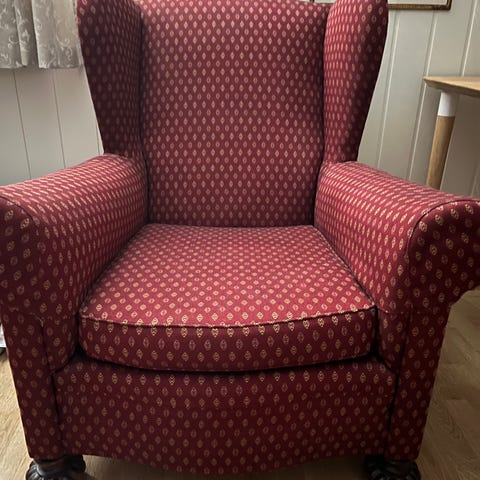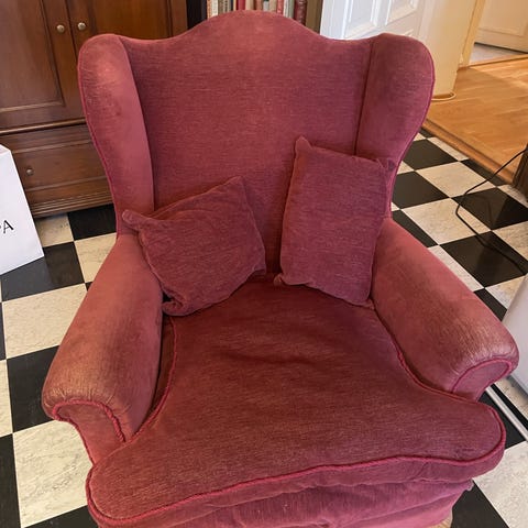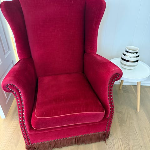 Helt spesiell dronningstol/forfatterstol i rød velur gis bort til de som henter i andre etasje i Trangesmauet 1B i løpet av helga. Stolen er ikke ferdig fikset. Mangler litt nagler langs kanten. 43 centimeter sittehøyde. En stol og krype opp i.