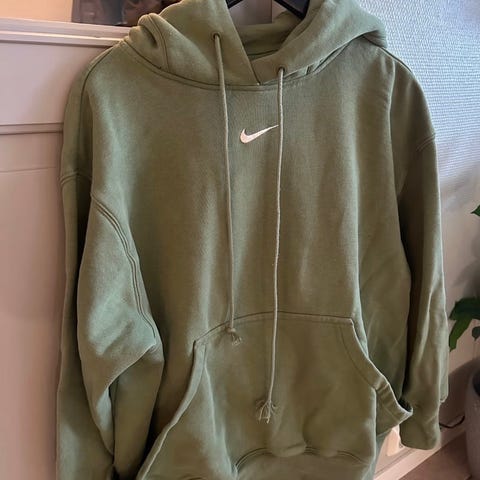 Nike hettegenser for dame i størrelse S. Genseren er gråmelert,Den har hette uten snøring, lang erm og stort Nike-logo på brystet. Passer til hverdagsbruk og lett trening.Liten L passer S/M