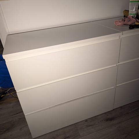 Mangler en av plankene mellom skuffene. Påvirker ikke funksjonen. Må hentes