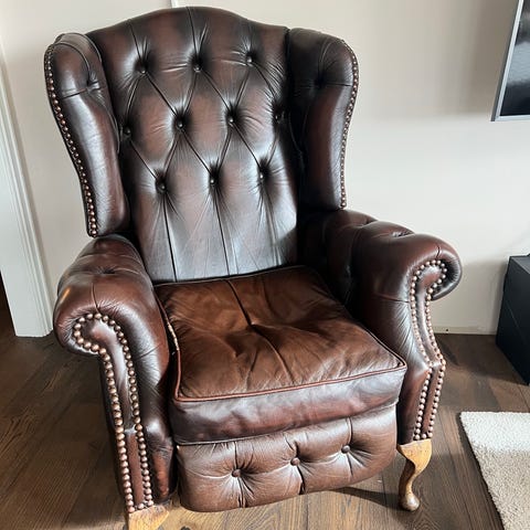 Chesterfield ørelappstol/høy rygg, I skin.