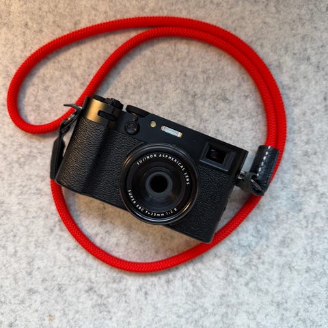 En brukt x100v i veldig god stand! Noe kosmetiske skader, men ingenting som påvirker bildene. Dette er nok det kameraet jeg har brukt mest, så litt vemodig å skulle selge. Men jeg ønsker å oppgradere. Kjøpt brukt på finn i 2023.
