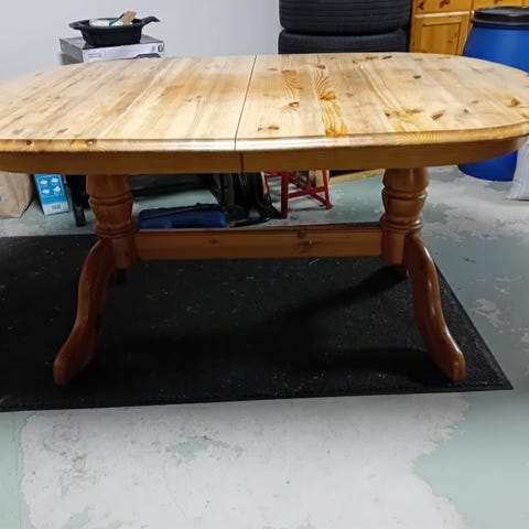 Selger godt brukt dpisebord med avrundede hjørner. En klaff integrert under bordplate. Lakkert heltre furu, noen riper og litt ujevn bordplate.