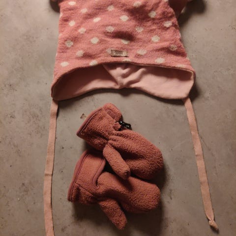 Pent brukt kattnakken hette lue str 1 og kattnakken regnvotter med for str 0-1 selges. Ingen hull eller skader som jeg kan se.