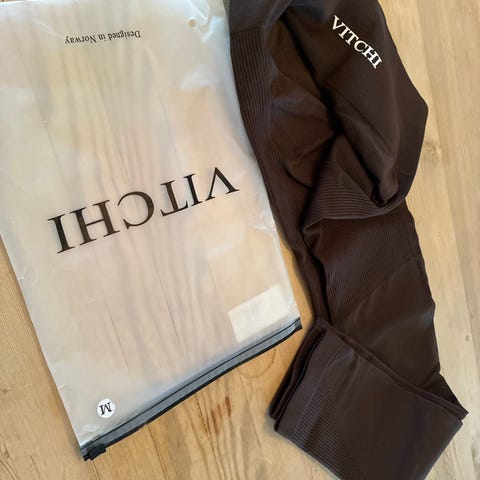 Selger en kjempefin treningstights fra Alo Yoga i en nydelig, dyp brunfarge (Espresso). Tightsen har en klassisk høy midje som sitter godt på under trening, og den kjente hvite Alo-logoen på venstre legg.