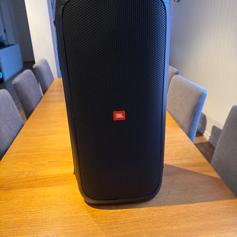 JBL PartyBox høyttaler med innebygde LED-lys i front. Høyttaleren er utformet som en bærbar festhøyttaler med hjul og bærehåndtak for enklere transport. På toppen finnes kontrollpanel med volum- og avspillingsknapper, lyskontroll og tilkoblingsvalg. Enheten kan brukes til musikkavspilling innendørs eller utendørs, og har strømtilkobling via kabel. Passer til bruk som partyhøyttaler, til arrangementer eller som kraftig høyttaler i hjemmet.