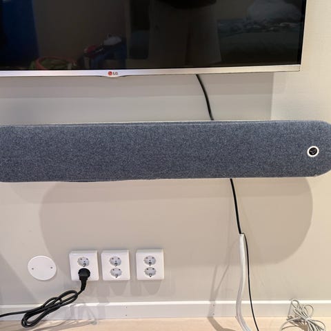 Harman Kardon soundbar i grå tekstilfinish. Enheten har innebygd display på toppen med berøringsknapper for avspilling og volumkontroll. Støtter Bluetooth-tilkobling for trådløs avspilling fra kompatible enheter. Egnet til bruk sammen med TV eller som frittstående høyttaler i stue eller andre rom. Strømtilkobling via kabel.