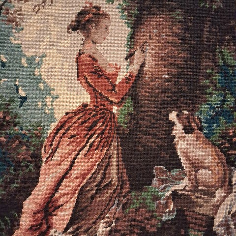 Maleri/trykket tekstil på lerret som viser et skoglandskap med trær og vegetasjon, samt en kvinne i rød kjole i forgrunnen. Bildet er montert på en treramme/bårelist, som vises på baksiden. Motiv og farger gir inntrykk av et detaljert naturmotiv med figur, egnet som veggdekor i for eksempel stue, gang eller soverom. Ingen synlig signatur eller tittel på bildene som er vist. Nydelige farger med en antikk stil.