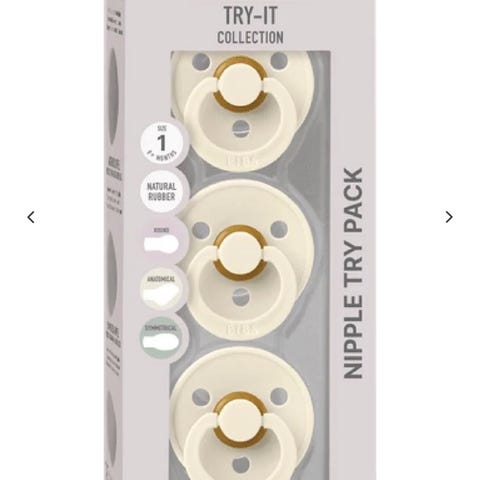 Helt nye BIBS Try-It Collection smokkepakke. Pakken inneholder 4 ulike smokker med forskjellige smokketupper og design. Helt nye og ubrukte da baby her foretrekker mam. Esken har en liten skade ettersom den har blitt liggende i en skuff🧸