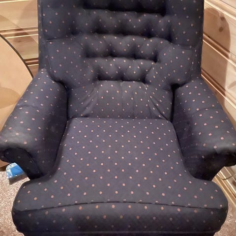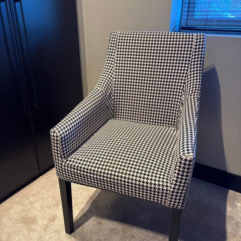 Gir bort en pen og moderne stol med klassisk sort-hvitt mønster.