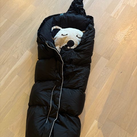 Vintervognpose med dun. Ukjent merke, står winter kids på den. Var like fornøyd med denne som med voksi posen vi også brukte.