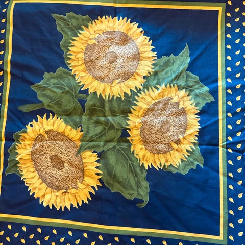 Flott vintage stoffrest fra Prestigious Textiles, kvalitet “Josephine”, farge Corn, United Kingdom. Delikat blomstermotiv (solsikker) i gule og grønne toner på lys bunn.