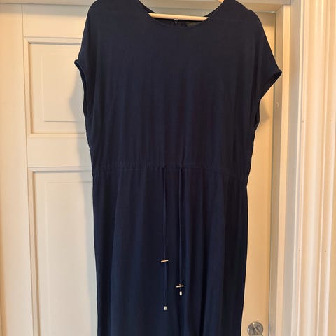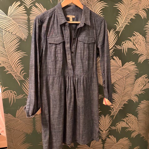 Burberry hverdagskjole for dame i størrelse M. Kjolen er svart og laget i bomull. Den har korte ermer og rett passform. Detaljer som knapp og innvendig merkelapp viser Burberry-logo og vaskeanvisning. Den har lommer.
