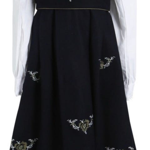 Nydelig festdrakt i blått med stakk, hvit skjorte og halstørkle. Festdrakt en er i størrelse 14 år men er lagt opp nederst og brukt av jente fra 10 år. Sømmen er ikke perfekt, selges derfor billig. (Dette vises ikke annet enn på innsiden av oppbrett). Ellers ingen bruksmerker eller slitasje.