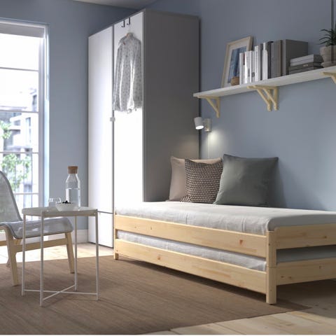 IKEA enkeltseng i ubehandlet furu. Sengen har en liggeflate på ca. 90x200 cm og en enkel sengegavl. Rammen er i heltre furu med plass under sengen til oppbevaring. Passer til standard enkel madrass 90x200 cm. Egnet til soverom, gjesterom eller barnerom. Selges uten madrass. Må hentes! Se mål på IKEA eller på bilde i annonsen.