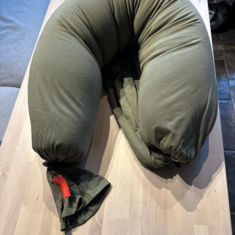 Gravidpute fra Bbhugme i olivengrønn farge. Puten kan brukes til avlastning av rygg, mage og hofter under graviditet, eller som støtte ved amming og hvile. Trekket ser ut til å være i et mykt tekstilmateriale.