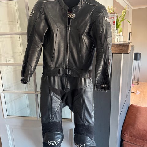 Dette er en hel skinndress i skinn, med knepucker og harde beskyttere på skuldre og knær. Den passer godt til aktiv kjøring og banedager.