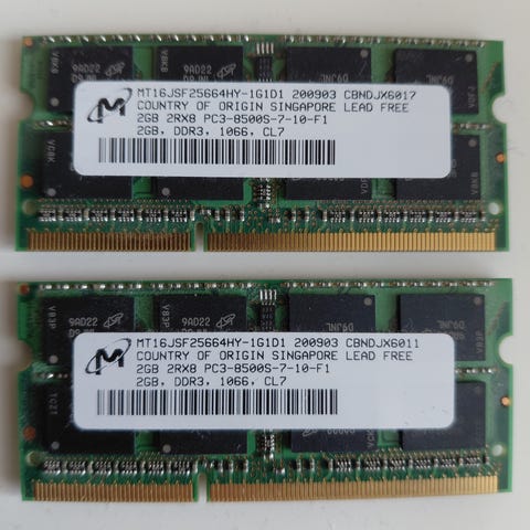2 stk Samsung M471B5673EH1-CF8 RAM-modul med kapasitet på 2 GB. DDR3-minne med 2Rx8-konfigurasjon. Egnet som arbeidsminne i kompatible datamaskiner eller bærbare PC-er som støtter denne typen DDR3 RAM-moduler.