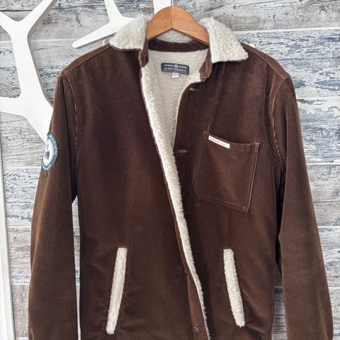 Amundsen jakke for herre i størrelse M. Jakken er laget i gul cordfløyel med mykt, lyst fôr på innsiden. Den har krage med fôr, knappelukking foran, brystlomme og to frontlommer. Patch på ermet og liten Amundsen-logo på brystet.