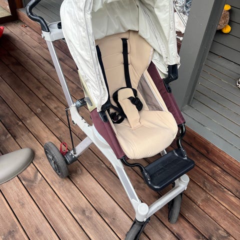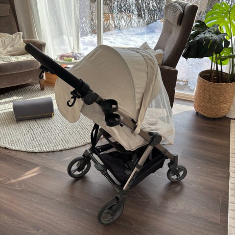 Twistshake barnevogn i lys beige tekstil med justerbar sittedel. Vognen har kalesje, frontbøyle og fempunktssele. Understellet har fire hjul og varekurv under setet.