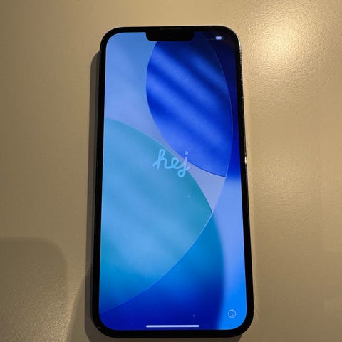 Apple iPhone 15 mobiltelefon med 128 GB lagringskapasitet. Modellen har svart front og bakside med to kameraer på baksiden. Noen synlige riper og bruksmerker.