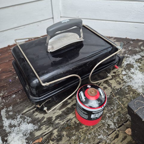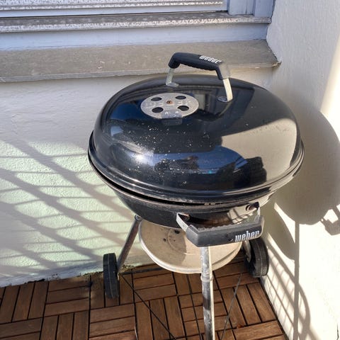 Selger en bærbar kulegrill fra Weber. Den er helt i orden