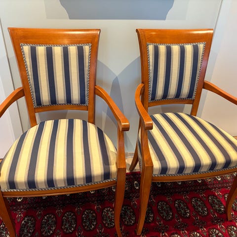 Selger fire flotte stoler i god kvalitet. Sannsynligvis utført i bok. Stål-ben bak med beskyttelse mot gulv.