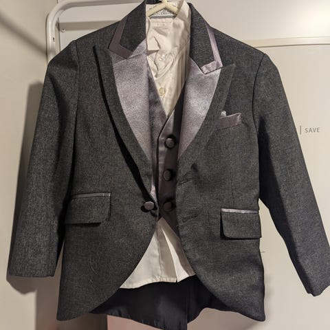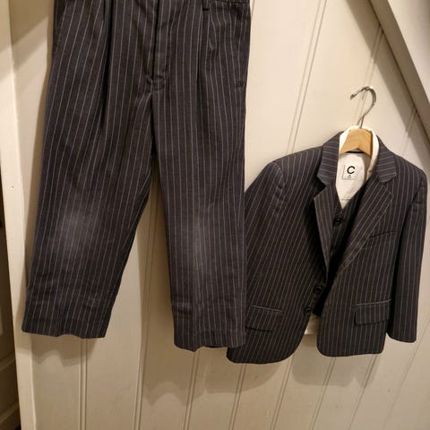Selger en kjempefin og stilig 3-delt dresspakke som skiller seg ut! Dressen har et flott strukturert mønster i gråtoner og hvit, som gir et eksklusivt og moderne uttrykk. Perfekt for bryllup, dåp eller andre festlige anledninger.