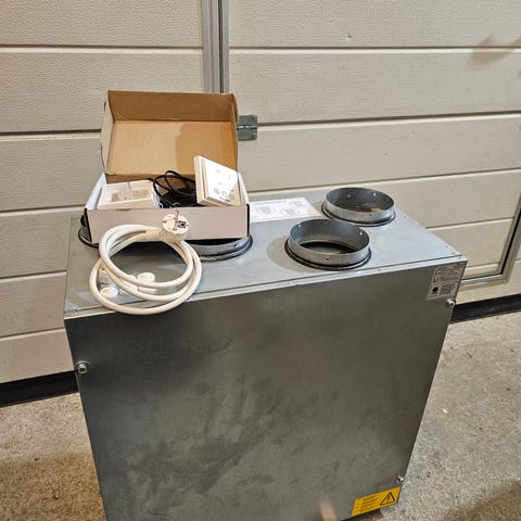 Ventilasjonsaggregat med gjenvinning og air condition. Ventilasjon på maks gir 450 m3/time. Aggregatet har vært godt vedlikeholdt med bytte av lagere, kondensatorer og filtre. Modell -98.
