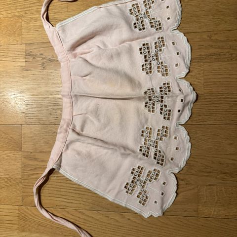 Forkleet har knyting i livet og nakkebånd. Stoffet er lett og luftig, typisk for eldre kvalitetstekstiler. Perfekt for deg som liker vintage, tradisjonelt håndarbeid eller ønsker et dekorativt element på kjøkkenet.