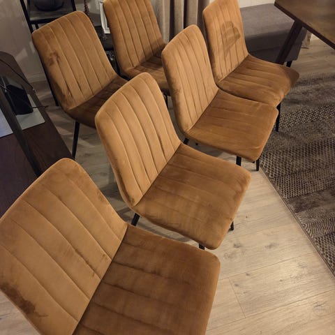 Selger mine okergule spisestuestoler 4 stk til sammen, da vi har kjøpt nye og ikke trenger disse lenger. Må hentes.