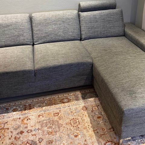 Square sofa er en enkel og behagelig sofaserie med god komfort. Et moderne samt tidløst design gjør det enkelt å få modellen til å passe til eksisterende interiør. Square sofa gjør det enkelt å skape et rent og nøytralt uttrykk samtidig som du får god komfort. Vendbare puter og oppsett forlenger levetiden og gir deg fleksibilitet til din innredning. Sofaen produseres av Hjellegjerde med stort fokus på kvalitet, komfort og særpreg. Dette oppsettet har vendbar sjeselong og er trukket i tekstil Reda lys grå med sorte ben og to nakkestøtter.