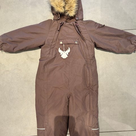 Hette med fuskepelskant, glidelås foran med klaff og trykknapper, seler, samt lommer foran. Fotstrikk er som nye.