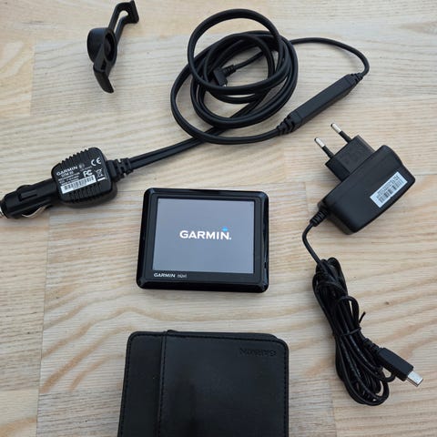 Garmin Nüvi GPS-navigasjon til bil. Enheten har fargeskjerm med kartvisning og norske menyer. Monteres på dashbord eller frontrute med medfølgende holder. Strømtilkobling via kabel i bilens uttak. Egnet som navigasjonsenhet for bilkjøring med visning av rute, veier og posisjon på kartet.