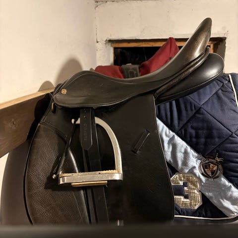 God behagelig sal selges da salen ikke passer rytter. 17,5" sete og utskiftbar bom. Står i XW nå, følger med W og MW. Salen er noe falmet på putene på kappene og på setet, noen små skraper på kanten på setet, se bilder. Salen er oppbevart inne når den ikke har vert brukt.