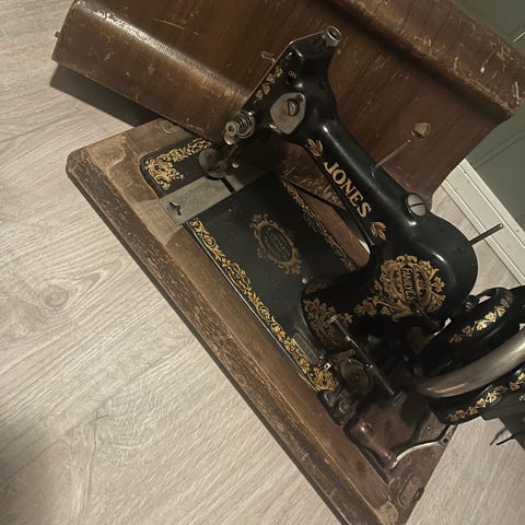 Mundlos symaskin med trelokk. Symaskinen står i en trekasse med buet lokk, trolig laget i treverk med synlig åremønster. Passer som bruksgjenstand eller som dekorativt innredningselement i hjemmet eller systuen. Detaljer om modell, funksjoner er ikke oppgitt og bør kontrolleres ved nærmere.