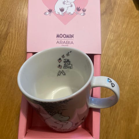 Koppen har motiv fra Mummiverdenen rundt hele yttersiden, med detaljtrykk også på innsiden. Volumet er 0,3 liter, egnet til varm og kald drikke. Laget i porselen, med hank for godt grep.