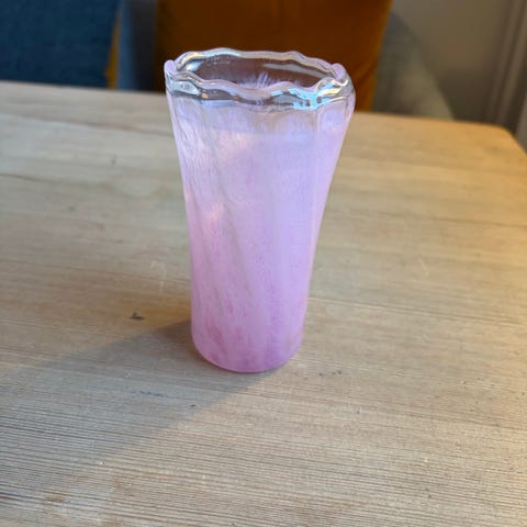 Magnor Glassverk vase i rosa glass. Vasen er sylinderformet med klart glass nederst og farget glass øverst. Den har en smal åpning som egner seg til enkeltblomster eller mindre buketter. Signatur inngravert i glasset. Passer som dekorasjon på bord, hylle eller vinduskarm.